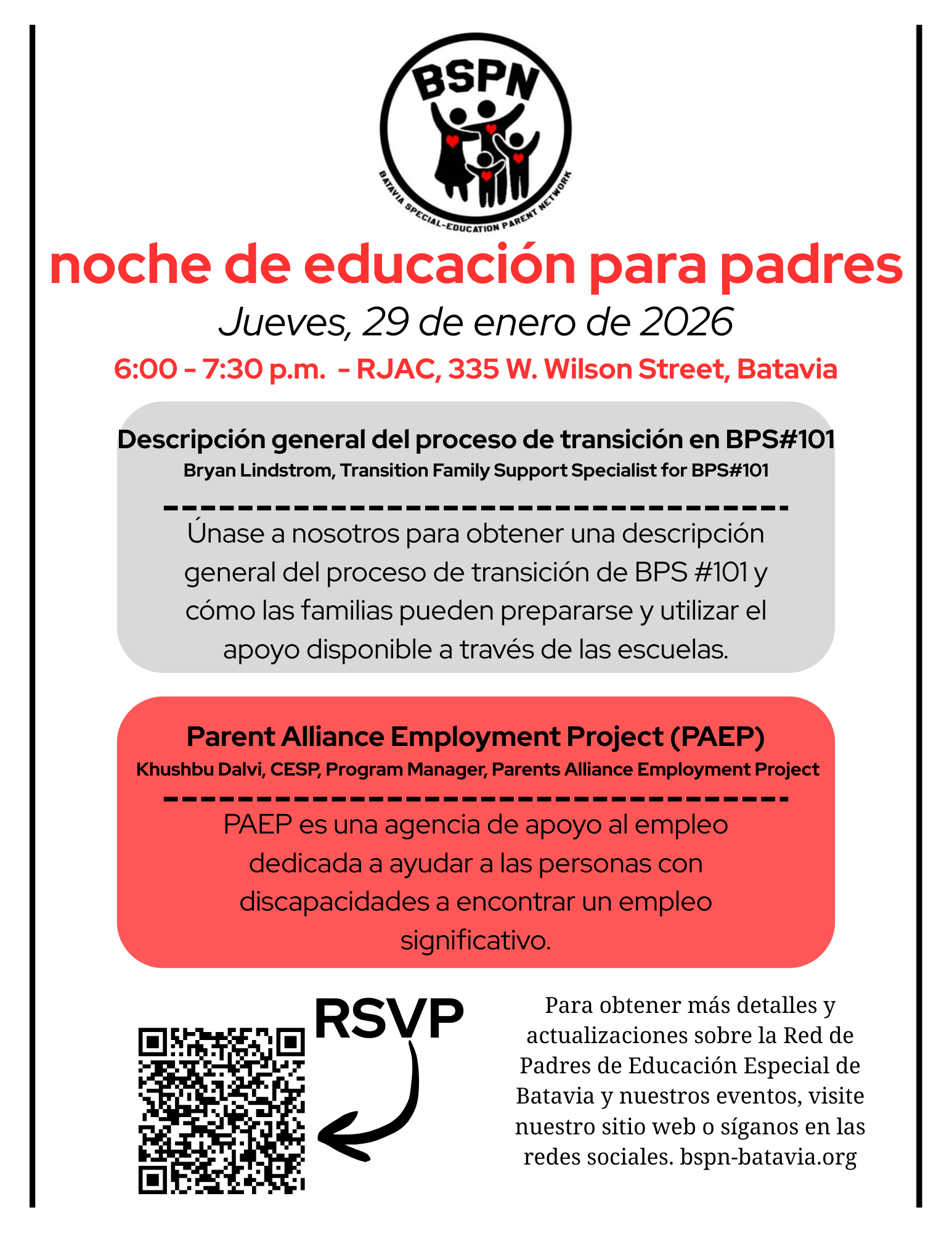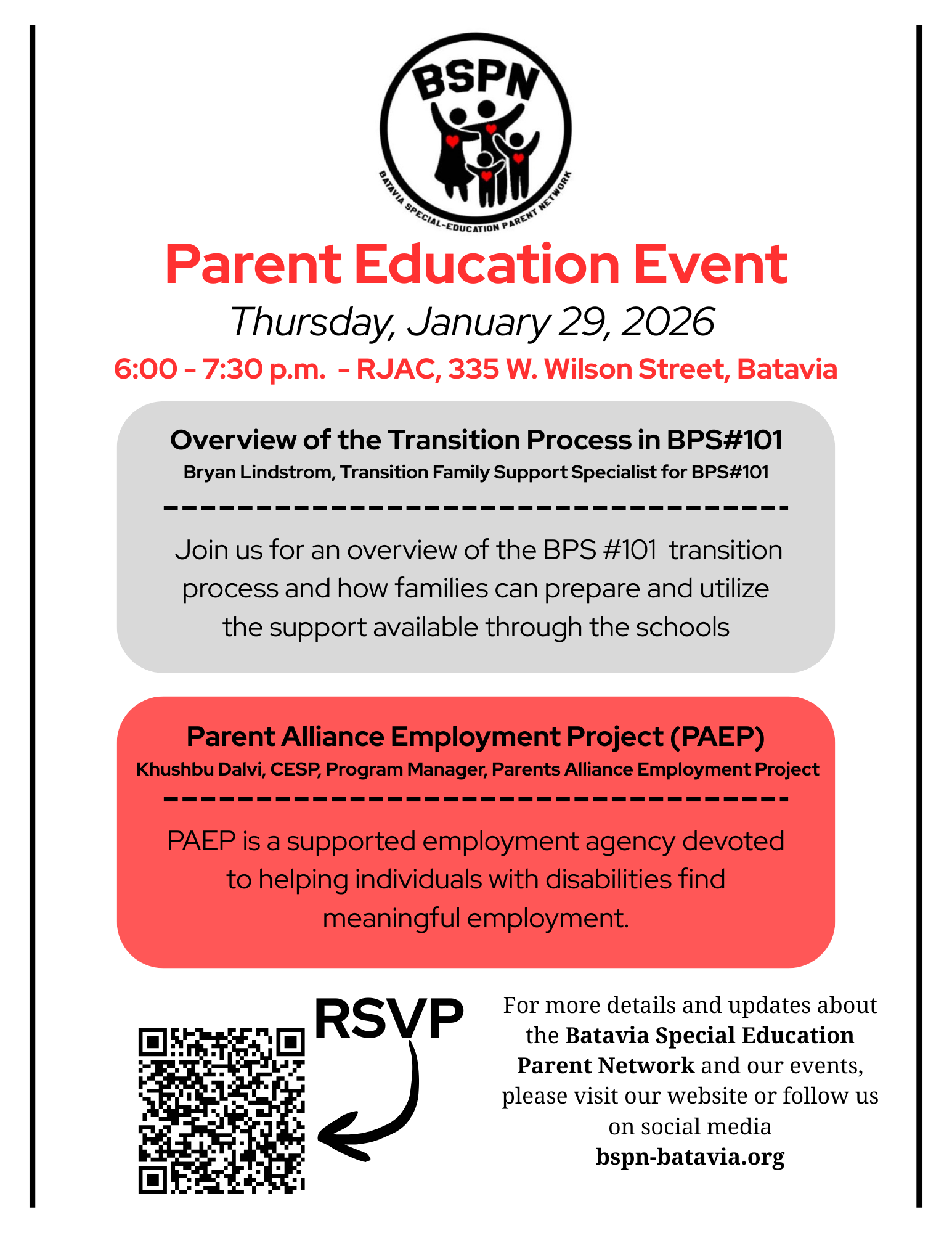 | Batavia Special-Education Parent Network - Parent Education Event (English) Parent Education Event (Spanish) | Parents | January 28, 2026 |